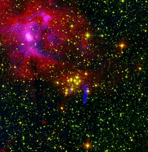Figura: O azul representa o gás interestelar quente, as estrelas surgem a cor verde e a poeira quente a vermelho. As estrelas super gigantes vermelhas são as estrelas de maior brilho ao centro.